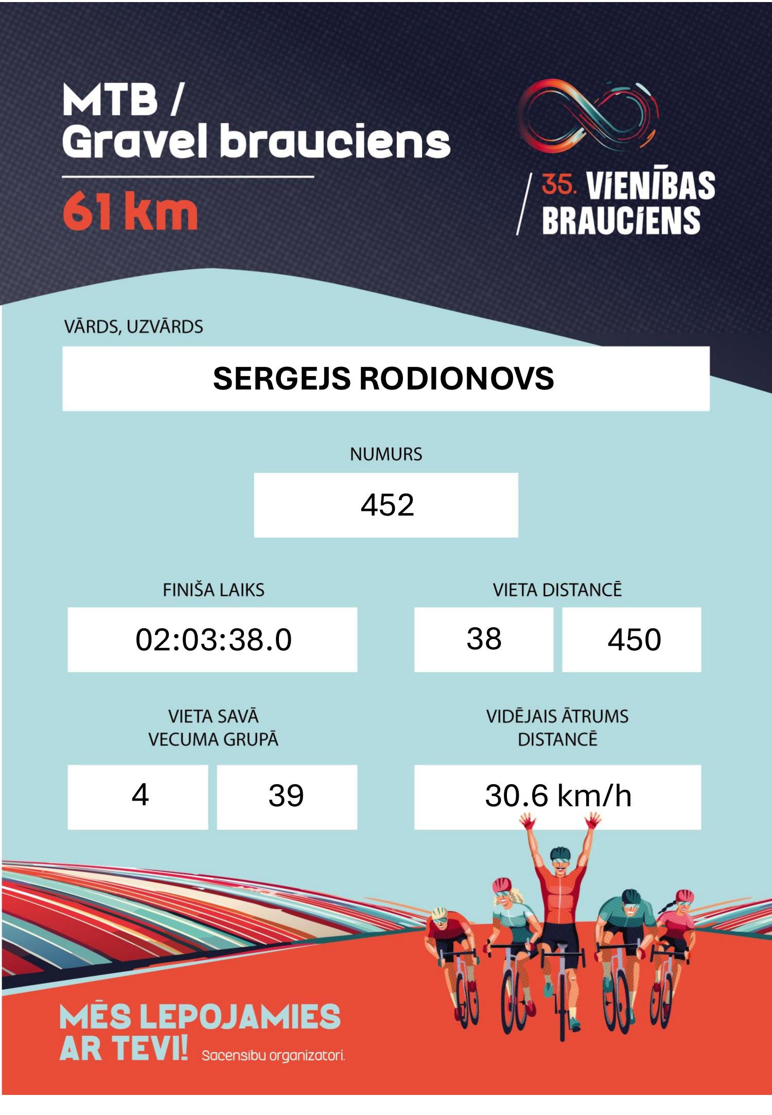 | 38 | 452 | SERGEJS RODIONOVS | 1965 | 02:03:38.0 | +00:15:04.5 | ĀdažiVelo | 🇱🇻 LAT | M-55 |