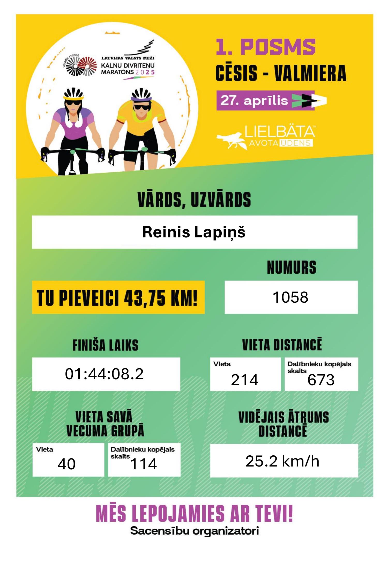 | 214 | 1058 | Reinis Lapiņš | 1987 | 01:44:08.2 | +00:20:57.9 | Velo Iecava | 719 | 🇱🇻 LAT | M35-39 |