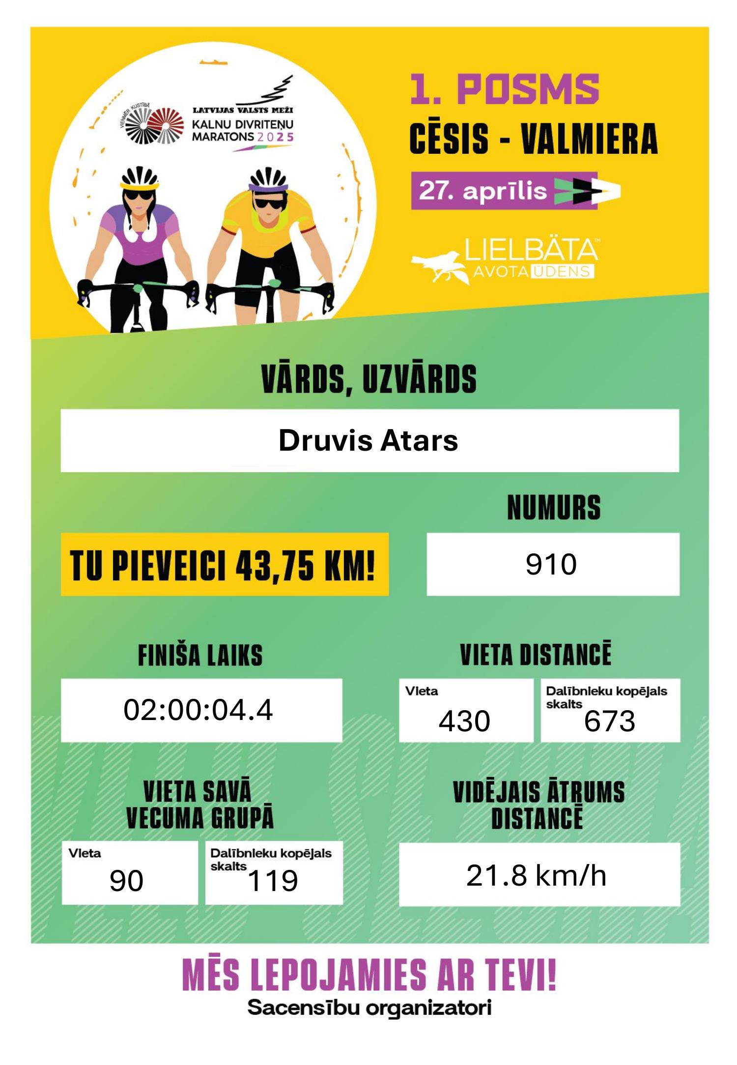 | 430 | 910 | Druvis Atars | 1984 | 02:00:04.4 | +00:36:54.1 | Pretpūlksteņrādītājvirziens | 623 | 🇱🇻 LAT | M40-44 |