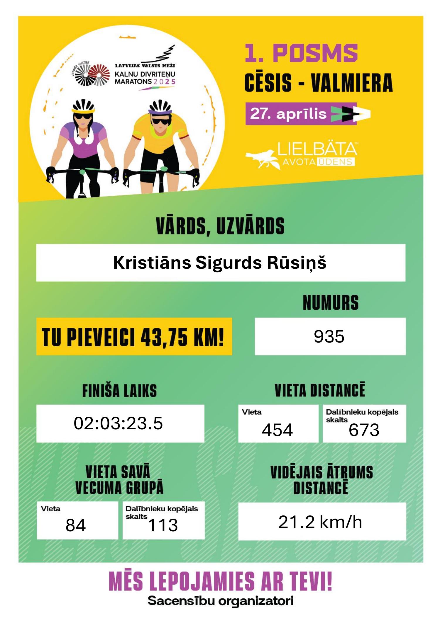 | 454 | 935 | Kristiāns Sigurds Rūsiņš | 2000 | 02:03:23.5 | +00:40:13.2 | CapyCycleTM | 607 | 🇱🇻 LAT | M19-34 |