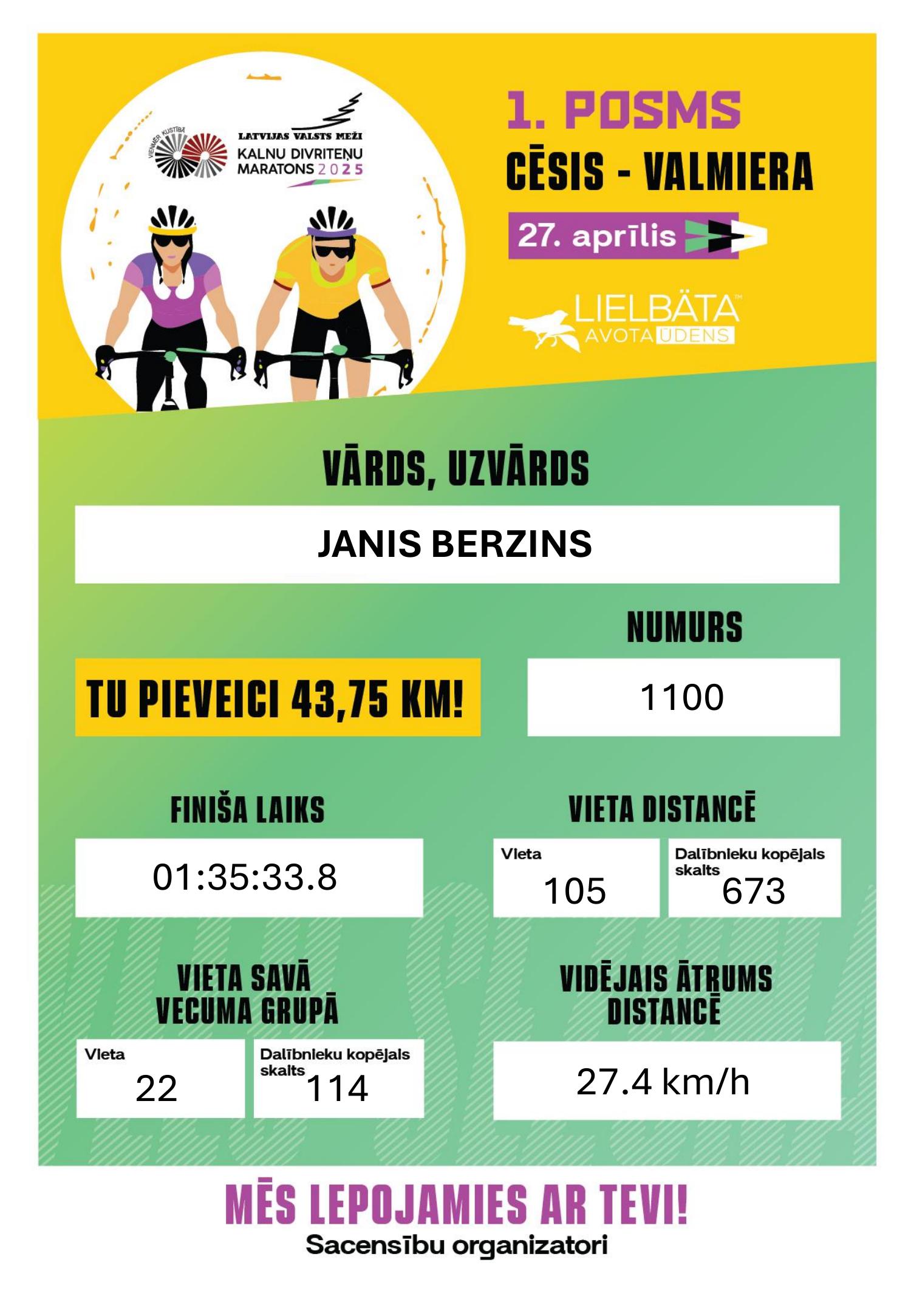 | 105 | 1100 | JANIS BERZINS | 1986 | 01:35:33.8 | +00:12:23.5 | Valmieras velo vienība | 783 | 🇱🇻 LAT | M35-39 |