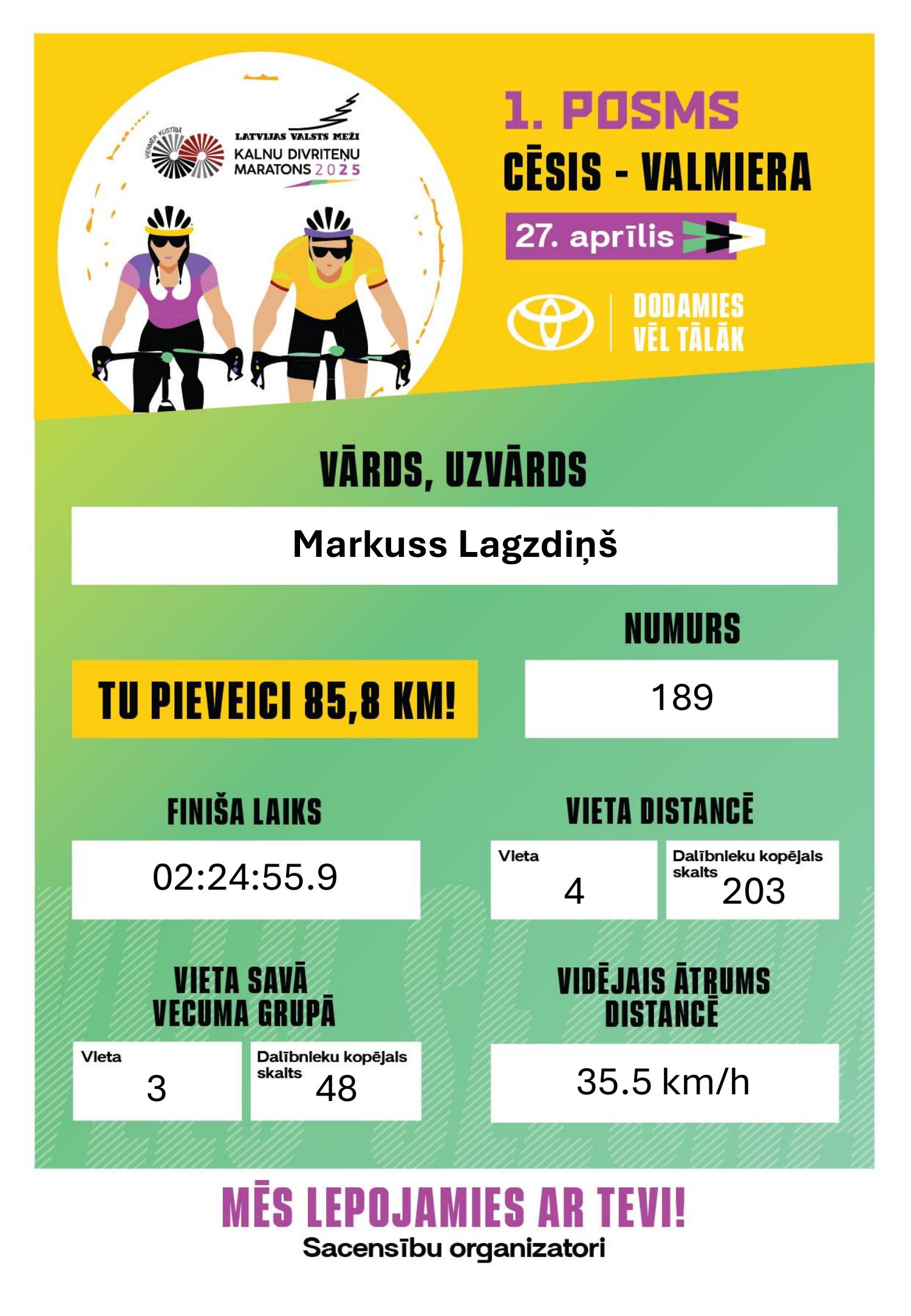 | 4 | 189 | Markuss Lagzdiņš | 2006 | 02:24:55.9 | +00:05:07.7 | Feelfree.lv | 965 | 🇱🇻 LAT | M19-34 |